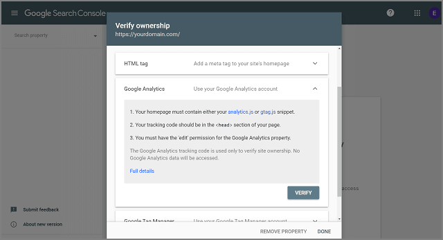 You will be offered 5 different methods to verify the ownership of your domain. Out of those 5 methods, the most simple one is through Google Analytics.